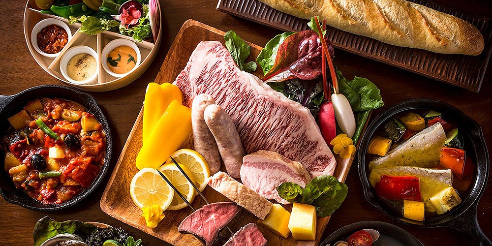 ボリューム満点のアンガス牛や、天橋立産の生ソーセージ、活きアワビ、宮津産地魚のアクアパッツァなどをお楽しみいただけます。