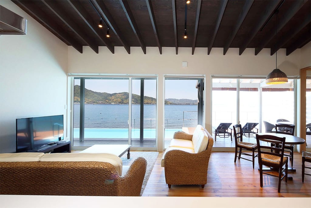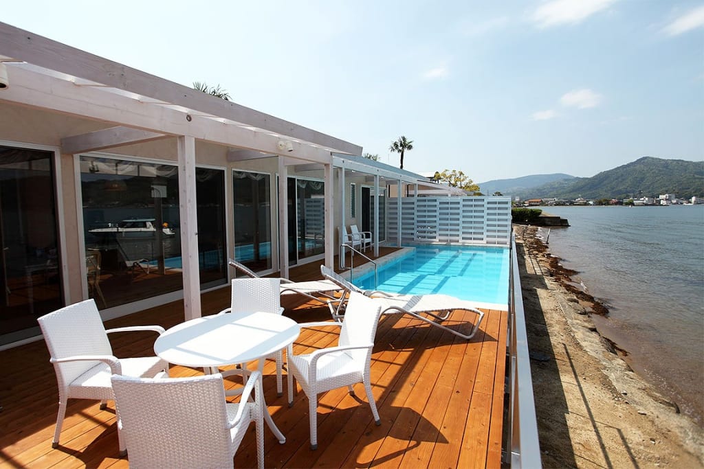 宮津湾のすぐそば、まさに“海まで0m”というロケーションに建ち、オーシャンビューのテラスとプライベートプールが人気を集めています。