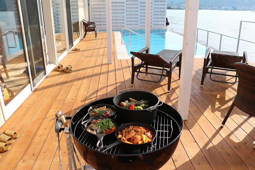 ウッドデッキで潮風を感じながらのBBQは、まさに“非日常の朝と夜”。